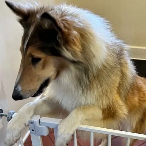 Please meet Barbie, a collie who loves people. Although 3 years old, Barbie still has the energy level of a puppy and is an exuberant girl. She will play chase with the other dogs inside the house to burn off energy. Outside, she both plays and explores. When she wants to cuddle, she sometimes bounds over the back of the couch to lie next to her human. Her foster thinks Barbie would do well with someone who is active and happy to help her burn off her excess energy. Barbie is curious about their cat but hasn’t interacted when not in a crate. She has interacted well with easy going dogs not bothered by her diva ways. Barbie knows the command to stay and has been working on other commands. When crated, Barbie plays happily with her toys.
